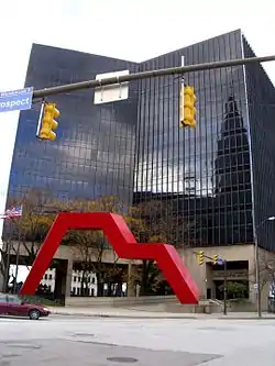 The Frank J. Lausche State Office Building is a 1979-erected 204 foot 15 story high-rise in downtown Cleveland on the corner of West Superior and Prospect Avenue on the city's Tower City Center complex.[1] It sits in front of the 2002-built Carl B. Stokes United States Courthouse. The buildings majority of tenants (over 1300) work for the State of Ohio. The structure cost the state $26 million to build in 1977-1979. [2] That would be about $83.5 million in today's inflation rate.[3] In front of the building sits sculptor Tony Smith's Last.[4]
