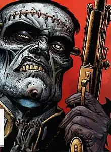 Frankenstein is an undead body composed of parts from several corpses stitched together, created by Victor Frankenstein some time in the 19th century. He was assumed dead in the Arctic when he sank beneath the ice, but he survived and swam to America, having 'many adventures'. He was revived by Victor Adam, and vowed vengeance for restoring him to life, successfully killing him, but accidentally bringing about a coma for Doctor Thirteen's wife, Maria, in the process.[3] In particular, Frankenstein became a frequent enemy of Melmoth, who he referred to as the Ringmaster of the Circus of Maggots. In a climactic battle in the year 1870, Frankenstein faced Melmoth and stopped him from destroying a town with maggot-hominids. The fight took place on a moving train, which was derailed during the conflict, and Frankenstein's fate was unknown.