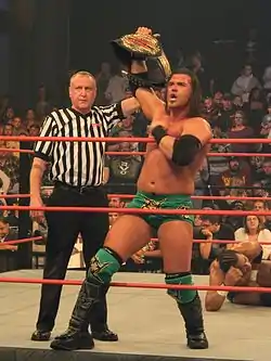 Kazarian also worked for Pro Wrestling Guerrilla, and won a tournament to become the first ever PWG Champion on August 30, 2003.[2][10] He held the title until February 22, 2004 when he was defeated by Adam Pearce.[11] On July 10, 2004, he became their first 2-time champion, however, when he regained the title from Adam Pearce in a "Loser Leaves PWG" steel cage match.[12] He would hold the title until November 13, when he was defeated by Super Dragon.[13]