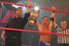 At the 2007 Turning Point pay-per-view, he was partnered with Booker T against Christian Cage and Robert Roode, with Kaz and Booker winning.[34] He then began attacking Dustin Rhodes, and stealing things from Rhodes' alter ego "Black Reign". He defeated Black Reign at Final Resolution.[35] After defeating Black Reign, Kaz and Black Reign competed in a Four Corner Mouse Trap match were Kaz won but Black Reign ended up getting his things back from Kaz after hitting Kaz with his Darkness Falls weapon. On February 23, Kaz defeated Rellik. After the match, Black Reign and Rellik attacked Kaz. Eric Young ran out to help but got too scared to do anything. At Destination X, Kaz and Young defeated Black Reign and Rellik leading to Kaz and Young (now 'Super Eric') becoming a tag team.[36] On April 13, at Lockdown 2008, they won the Cuffed in a Cage match.[37] On the April 17 episode of TNA Impact!, following Lockdown, Kaz and Young defeated the holders of the TNA World Tag Team Championship, AJ Styles and Tomko and The Latin American Xchange (LAX) in a triple threat tag team match for the titles after Young's alter ego, "Super Eric" pinned Styles with a bridging suplex.[38] Later in the night, Styles complained to Jim Cornette that since Young was signed to the match, not Super Eric, and Young claimed that he and Super Eric are different people, Super Eric's involvement was outside interference.[38] When Eric refused to admit that he was Super Eric, Cornette vacated the titles.[38]