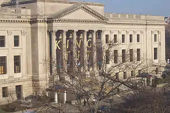 The institute's original building at 15 South 7th Street, later the home of the (now-defunct) Atwater Kent Museum, eventually proved too small for the institute's research, educational programs, and library. The Institute moved into its current home on the Benjamin Franklin Parkway, near the intersection with 20th Street, in 1934. The new facility was intended from the start to educate visitors through hand-on interactions with exhibits: "Visitors to this museum would be encouraged to touch, handle, and operate the exhibits in order to learn how things work."[6] Funds to build the new Institute and Franklin Memorial came from the Poor Richard Club, the City Board of Trust, the Benjamin Franklin Memorial, Inc., and the Franklin Institute. John T. Windrim's original design was a completely square building surrounding the Benjamin Franklin Statue, which had yet to be built. Despite the effects of the Great Depression, the Benjamin Franklin Memorial, Inc. raised $5 million between December 1929 and June 1930. Only two of the four wings envisioned by Windrim were built; these face the Parkway and share design elements with other cultural and civic structures around Logan Circle.