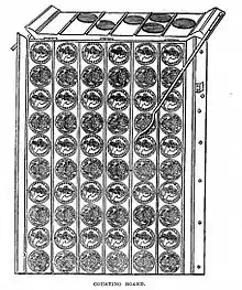 On taking office as Melter and Refiner, Peale implemented the changes he had recommended based on what he had seen in Europe. He also wanted additional mechanization in the mint's Coining Department, headed by Chief Coiner Adam Eckfeldt, whose son Jacob was the Philadelphia Mint's Assayer. Adam Eckfeldt had helped strike some of the first federal coins in 1792 and had been in his office since 1814. Eckfeldt was reluctant to adopt all Peale's recommendations, telling Peale's nephew, engineer George Sellers, "If Mr. Peale had full swing he would turn everything upside down ... he wants something better and no doubt he would have it if we were starting anew."[58] As improvements crept in despite Eckfeldt's caution, the Chief Coiner saw their value and became more enthusiastic, noting the savings in working time afforded by the Contamin lathe, which had been imported from France after being seen by Peale there.[58] To help deal with the increased output from the Philadelphia Mint, Peale invented a piling-box, allowing planchets or coins to be quickly stacked, and a counting board, speeding the work of the clerks. The counting board remained in use until the mints installed mechanical counters in 1934.[59]