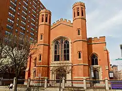 Franklin Street Presbyterian Church and Parsonage is a historic Presbyterian church located at 100 West Franklin Street at Cathedral Street, northwest corner in Baltimore, Maryland, United States. The church is a rectangular Tudor Gothic building dedicated in 1847, with an addition in 1865. The front features two 60 foot flanking octagonal towers are also crenelated and have louvered belfry openings and stained glass Gothic-arched windows. The manse / parsonage at the north end has similar matching walls of brick, heavy Tudor-Gothic window hoods, and battlements atop the roof and was built in 1857.