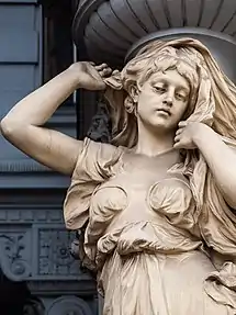 He soon received several large commissions, including a monument to Henry II, Duke of Austria, for the Elisabethbrücke (now at the Rathausplatz), and sculptures for the Aspernbrücke, symbolizing war, peace, fame and prosperity. They were destroyed in 1945, during World War II. He also created four allegorical figures directly above the entrance to what is now the Hotel Imperial, representing wisdom, honor, justice and strength.