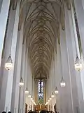 It is among the largest hall churches in southern Germany. The hall is divided into 3 sectors (the main nave and two side aisles of equal height (31 metres (102 ft)) by a double row of 22 pillars (11 at either side, 22 metres (72 ft)) that help enclose the space. These are voluminous, but appear quite slim because of their impressive height and the building's height-to-width ratio. The arches were designed by Heinrich von Straubing.