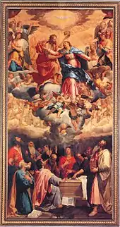 A rich collection of 14th to 18th century artwork of notable artists like Peter Candid, Erasmus Grasser, Jan Polack, Hans Leinberger, Hans Krumpper and Ignaz Günther decorates the interior of the cathedral again since the last restoration.[9] The Gothic nave, several of the Gothic stained-glass windows, some of them made for the previous church, and the tomb monument of Louis IV, Holy Roman Emperor are major attractions. For the daily choral prayers Erasmus Grasser created in 1495–1502 the choir stalls with busts of apostles and prophets and small statues which survived the alterations of the Baroque period and the Gothic Revival, but burned in World War II, only the figures had been relocated and preserved. Therefore, the Frauenkirche still has the largest surviving ensemble of characters from the Late Gothic in Germany. The optical end of the sanctuary is formed by a column on which stands the St. Mary statue by Roman Anton Boos, which he executed in 1780 for the sounding board of the former pulpit. The former high altar painting completed by Peter Candid in 1620 has been moved to the north wall entrance of the sacristy and depicts the Assumption of Mary into heaven.