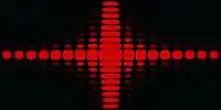 The form of the diffraction pattern given by a rectangular aperture is shown in the figure on the right (or above, in tablet format).[13] There is a central semi-rectangular peak, with a series of horizontal and vertical fringes. The dimensions of the central band are related to the dimensions of the slit by the same relationship as for a single slit so that the larger dimension in the diffracted image corresponds to the smaller dimension in the slit. The spacing of the fringes is also inversely proportional to the slit dimension.