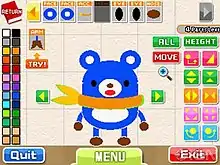 In Freakyforms, players must first create an on-screen character, known as a "Formee". Formees are created using various shapes placed however the player decides. After the character is completed, players use the touch screen to navigate the character throughout the game world.[1] As the player explores, they are asked to complete assigned tasks within a given time limit, such as collecting a number of items or assisting other characters.[1] With continued play, additional features are unlocked, such as using the handheld's augmented reality features to take pictures of their creations in a real-world setting.[2] Users may share their Freakyforms content by using the Nintendo 3DS system's StreetPass feature or by creating QR codes that can be scanned using the system's outer cameras.[2]