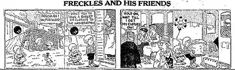 In May 1915, 23-year-old Merrill Blosser began working for the Chicago syndicate Newspaper Enterprise Association, initially drawing cartoons based on news events. That summer he began drawing five comics features. One of these, titled Freckles, began as a one-column daily gag panel on August 16, 1915.[1] that expanded into a full comic strip and was retitled Freckles and His Friends on September 20, 1915.[2][1] One by one, Blosser dropped each of the other single-panel comics and, in July 1916, he began another strip, Miniature Movies, which soon became Chestnut Charlie, continuing until early in 1918. At that point, Blosser then dedicated himself exclusively to the production of Freckles and His Friends.[4][5]