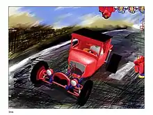Hot rod based on 1929 Ford Closed Cab Pickup, but is digitally powered by an imaginary computer circuit. The figure in upper right corner is derived from the Mayan Sun God, also powered by an imaginary computer circuit. (Print)