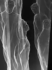 In developing Ex Nihilo—the central sculpture, by far the largest of the group—Hart studied the combination of figurative and abstract forms in Rodin’s massive sculpture, The Gates of Hell.[26][27] The final, full-size version of Ex Nihilo spans 21 feet, and stands two stories high.[2] "The spiraling forms that recur throughout Hart's Ex Nihilo suggest the spirals that are found in nature—in sunflower heads, nautiluses, hurricanes, and galaxies."[28] Hart intended the title as a double reference to Aristotle ("out of nothing nothing can be made") and the Bible ("everything is made out of nothing").[29]