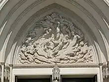 Undeterred, Hart submitted a revised design of his own. Guided by the writings of Pierre Teilhard de Chardin, and the idea of a dynamic universe, whirling into existence, Hart developed a revolutionary, unifying vision for the entire west façade.[24] To the committee's approval, he submitted new models for the central tympanum, for the left and right tympana, and for the figures on the trumeaux below them.[25]