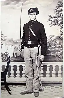 Frederick Baker was born in Spratton, Northamptonshire, England. He emigrated from there with his parents and seven siblings to Elyria, Ohio in 1852. In 1863, he was selected to be a member of the Seventh Independent Company of Ohio Volunteer Cavalry, also known as the Union Light Guard.[1] Soon after arriving in Washington D.C. members of the unit learned they were selected to serve as a mounted escort and guard for President Abraham Lincoln.[2]