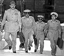 The Free Officers (Arabic: حركة الضباط الأحرار, romanized: Ḥarakat a-dubbāṭ al-ʾaḥrār) were a group of revolutionary Egyptian nationalist officers in the Egyptian Armed Forces and Sudanese Armed Forces that instigated the Egyptian Revolution of 1952. Initially started as a small rebellion military cell under Abdel Moneim Abdel Raouf, which included Gamal Abdel Nasser, Hussein Hamouda, Khaled Mohieddin, Kamal el-Din Hussein, Salah Nasr, Abdel Hakim Amer, and Saad Tawfik, it operated as a clandestine movement of junior officers during the Palestine War of 1948-1949.[1] The nationally respected war hero Mohamed Naguib joined the Free Officers in 1949. Naguib's hero status, and influence within the army, granted the movement credibility, both within the military and the public at large. He became the official leader of the Free Officers during the turmoil leading up the revolution that toppled King Farouk in 1952.