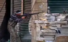 An FSA fighter engaged in a firefight in Aleppo