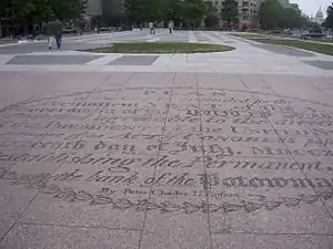 Oval containing the title of the L'Enfant Plan followed by the words "By Peter Charles L'Enfant" inlaid in Freedom Plaza. (2006)