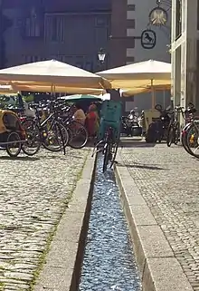 The Freiburg Bächle are small water-filled runnels or formalised rills in the Black Forest city of Freiburg. They are supplied with water by the Dreisam and can be seen along most streets and alleyways in the old city, being one of the city's most famous landmarks. The word Bächle comes from the German Bach, meaning brook, with the Alemannic diminutive ending -le.
