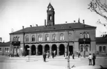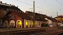 During the 1870s, the Baden Railway expanded the station with waiting rooms, utility rooms and a courtyard.[26] As a result of the annexation of Alsace after the Franco-Prussian War in 1871, Alsace-Lorraine was quickly connected to the rail network by the Freiburg–Colmar railway, which made a third platform track and second platform necessary. The Elz Valley Railway branching from the Rhine Valley Railway in Denzlingen opened to Waldkirch in 1875 and was extended to Elzach in 1901.[27]