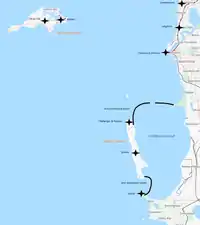 To protect the anchorage at Cockburn Sound, a major engineering project was required. An almost 9.5 km long anti-submarine net in the shape of an arch spanned from the north-eastern end of Garden Island to Woodman Point, on the mainland. Construction of this barrier took from 1942 to 1944.[16][17] From Woodman Point, the barrier ran west on top of the Parmelia Bank, a sandbank stretching to Carnac Island. A dredged channel, the location of a gate in the barrier, let through the sandbank into Cockburn Sound. From this channel, the barrier ran south-west to Garden Island.[18]