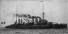 Danton was laid down at the Arsenal de Brest in February 1906.[1] Her launching was scheduled for May 1909, but socialist activists prevented the ship from leaving the stocks,[3] and so the launching was delayed until on 4 July 1909. After completing fitting-out work, she was commissioned into the French Navy on 1 June 1911.[1] A week after she was completed, she was sent to the United Kingdom in honour of the Coronation of George V in 1911.[4] Upon her return to France, Danton was to the 1st Battleship Squadron in April 1912, along with her five sister ships.[5] Later that year, while off Hyères in the Mediterranean, Danton suffered an explosion in one of her gun turrets, which killed three men and injured several others.[6] In 1913, the squadron was joined by the two powerful dreadnoughts Courbet and Jean Bart.[4]