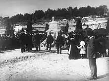The origin of the first explosion was traced to a 100 mm magazine and was believed to have been caused by decomposing Poudre B, a nitrocellulose-based propellant, which tended to become unstable with age and self-ignite, though a report published in April 1907 stated a torpedo exploded in the torpedo room directly below the magazine.[26] When burnt, it gave off yellow-coloured smoke, which matched the colour seen by eye-witnesses. To test this theory, Gaston Thomson, the Navy Minister, ordered on 31 March that a replica magazine and the adjacent black-powder magazine be built, but when the tests were conducted on 6–7 August, they were deemed inconclusive because the propellant used in the test was not of the same age as that aboard Iéna. Fallières appointed a technical commission on 6 August that included mathematician Henri Poincaré, chemist Albin Haller and the inventor of Poudre B, Paul Vieille, that failed to come to a definite conclusion. The navy's Propellant Branch (Service des Poudres et Saltpêtres) objected to the criticisms of its product, claiming that it was tested to resist 43 °C (110 °F) temperatures for 12 hours, although it never explained how that test was relevant to the long-term storage of Poudre B in magazines limited to natural ventilation, as was used by every ship in the fleet.[27] The Monis Commission published its report on 9 July, blaming the explosion on Poudre B, and was debated on 21–26 November. The Michel Commission published its report on 7 November 1908, although its contents had been debated on 16–19 October, and was "a model of vagueness and imprecision".[28] The reason for the explosion became a cause célèbre with accusations of gross negligence by the government such that Thomson was forced to resign on the last day of the debate.[29]