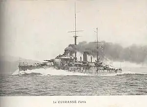 Paris was the third ship of four Courbet-class battleships, the first dreadnoughts built for the French Navy. She was completed before World War I as part of the 1911 naval building programme. She spent the war in the Mediterranean, spending most of 1914 providing gunfire support for the Montenegrin Army until her sister ship Jean Bart was torpedoed by the submarine U-12 on 21 December.[1] She spent the rest of the war providing cover for the Otranto Barrage that blockaded the Austro-Hungarian Navy in the Adriatic Sea.