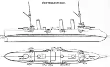 Design work on the ship began in 1891 with a version armed with four 240 mm (9.4 in) guns in the same lozenge arrangement as the contemporary pre-dreadnought battleships like Charles Martel. They were also to carry eight 138 mm (5.4 in) guns. The Conseil des Travaux (Council of Works) decided in a meeting on 7 July that displacement should be limited to 7,900 long tons (8,000 t) if possible; this limitation precluded an armament of four large-caliber guns if the latest water-tube boilers were retained. In an attempt to keep displacement under the limit, the Conseil considered scaling down the level of armor protection or reducing the caliber or number of guns. They ultimately decided to remove the amidships 240 mm guns and to supplement the ship's firepower with four more 138 mm guns.[3]