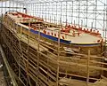 English plans of a sister ship, Concorde, were used. The cost was estimated to be $22 million.[2] The original plans had been modified in several ways for reasons of strength and safety: planks had been bolted rather than pegged to avoid movement during the long period of construction. Similarly, the mast sections were fastened with glue rather than metal hoops to avoid water penetration. The cannons are lightweight and non-functional to save weight. Manilla rope has been used for the majority of the rigging and the sails made of linen canvas.