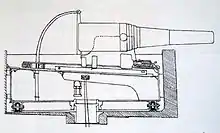 At some point the ship received a dozen 37-millimeter (1.5 in) Hotchkiss 5-barrel revolving guns.[2] They fired a shell weighing about 500 g (1.1 lb) at a muzzle velocity of about 610 m/s (2,000 ft/s) to a range of about 3,200 meters (3,500 yd). They had a rate of fire of about 30 rounds per minute.[5] The hull was not recessed to enable any of the guns on the battery deck to fire forward or aft. However, the guns mounted in the barbettes sponsoned out over the sides of the hull did have some ability to fire fore and aft.[2]