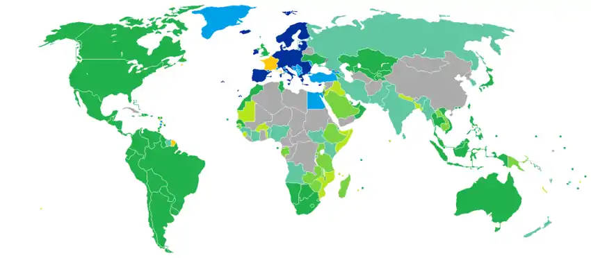 Because France forms part of the European Union, French citizens are also citizens of the European Union under European Union law and thus enjoy rights of free movement and have the right to vote in elections for the European Parliament.[41] When in a non-EU country where there is no French embassy, French citizens have the right to get consular protection from the embassy of any other EU country present in that country.[42][43] French citizens can live and work in any country within the EU and EFTA as a result of the right of free movement and residence granted in Article 21 of the EU Treaty.[44]