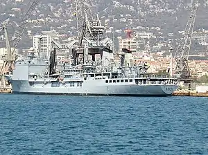 In French service, the final three Durance-class tankers are called Bâtiment de commandement et ravitailleur (BCR, "command and replenishment ship").[1] In addition to their role as a fleet tanker, the three ships dubbed BCR can accommodate an entire general staff and thus supervise naval operations as a command ship.[2] The three ships of the class designated BCRs, Var, Marne and Somme all have superstructures that were extended aft by 8 m (26 ft) to accommodate the additional staff requirements. The BCRs have one crane positioned along the centreline.[3]