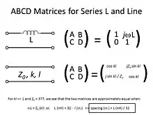 At this point in the development, the series inductors in the prototype L,C ladder network will now be replaced by sub-half-wavelength air spacers (which we will model as transmission lines) between the FSS layers. The thickness of the air spacers may be determined as shown in Fig. 3.1.3-1, in which we compare the ABCD matrix of a series inductor with the ABCD matrix of a short transmission line (Ramo [1994]), in order to obtain the proper length of transmission line between the shunt capacitors (sub-resonant FSS layers) to produce a Butterworth filter response. It is well known that a series inductor represents an approximate lumped circuit model of a short transmission line, and we'll exploit this equivalence to determine the required thickness of the air spacers.