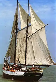 Fri was built for sail alone; she is a Baltic coastal trader constructed out of oak in 1912 in Svendborg, Denmark. She is 32 meters long with a gaff rig, hand winches, and traditional ropes and canvas sails.[5] In 1969 she carried 60 tons of cargo on an historic passage between Northern Europe and San Francisco. In 1970 she carried fresh water to the American Indian activists who had seized and occupied Alcatraz Island from the U.S. government. In 1971 under her new owners American David Moodie and his brothers, the Fri sailed from Hawaii to New Zealand crewed by a group of hippie consumer escapes, in search of adventure and an alternative lifestyle down-under. This epic voyage to New Zealand would result in the vessel and its owners carving their name in New Zealand peace history.[1][5][6]