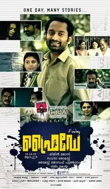 Friday is a 2012 Malayalam drama thriller film directed by Lijin Jose and starring Fahadh Faasil and Ann Augustine. Fahadh does the role of an auto rickshaw driver. The supporting cast includes Nedumudi Venu, Vijayaraghavan and Tini Tom. Produced by Sandra Thomas and Thomas Joseph Pattathanam under the banner of Innovative Film Concepts, the film is set and shot completely in Alappuzha. It released on 18 August 2012 to positive critical reviews.[1] Carrying a tag of One Day-Many Stories; the film has a multi-narrative aspect and is woven in the format of a hyperlink cinema.[2] Production Controller of Friday is Shibu G Suseelan.