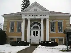 Friendship Free Library, also known as Pitt Memorial Library, is a historic library building located at Friendship in Allegany County, New York. Constructed of yellow brick in 1912, the building is composed of a five- by two bay, one story main block, with a large four by four bay block to the rear. The building features Arts and Crafts style decorative elements. The entrance is sheltered by a monumental gabled portico supported by four Corinthian columns.[2]