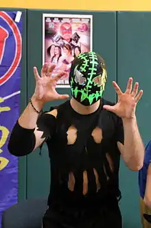 After a one-year hiatus, Chikara returned on May 25, 2014, with the You Only Live Twice internet pay-per-view. The Spectral Envoy worked the event's first match, where they were defeated by the new BDK of Ares, Nøkken and Tursas.[43] On September 19, The Spectral Envoy entered the 2014 King of Trios as the defending tournament winners. They were, however, eliminated in their first round match by Eddie Kingston, Jimmy Jacobs and Volgar, representing Chikara's new top rudo stable The Flood, after their stablemate Deucalion brought out Delirious to attack UltraMantis.[44] On December 6 at Tomorrow Never Dies, Delirious used the supposedly magical artifact Eye of Tyr to brainwash Frightmare and Hallowicked into turning against UltraMantis Black, breaking up the Spectral Envoy.[45] When Chikara's season 15 started on January 25, 2015, Frightmare and Hallowicked worked as rudos, separated from UltraMantis Black.[46] Early in the year, Frightmare entered the Challenge of the Immortals tournament as part of Hallowicked's "Nightmare Warriors" team, alongside Blind Rage and Silver Ant.[47] Frightmare, Hallowicked and Silver Ant also represented the Nightmare Warriors in September's King of Trios, where they made it to the quarterfinals, before losing to eventual tournament winners, Team AAA (Aero Star, Drago and Fénix).[48] On January 30, 2016, at the season 16 premiere, Frightmare and Hallowicked unsuccessfully challenged N_R_G (Hype Rockwell and Race Jaxon) for the Campeonatos de Parejas.[49] During the first half of 2016, Frightmare became part of Hallowicked's new rudo group, serving an entity known as "Nazmaldun". As part of the group, Frightmare became known as "The Spear of Nazmaldun".[50] Chikara's season 16 concluded on December 3 with two shows. In the main event of the first show, Frightmare defeated Amasis in a Mask vs. Mask match, forcing his opponent to unmask himself.[51]