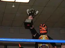 After managing to pin Crossbones in an eight-man tag team match on March 20, Mike Quackenbush suggested that Frightmare should start going after the Young Lions Cup.[23] Frightmare received his shot at the Cup on June 26, but was defeated when the champion, BDK member Tim Donst, choked him out with a necktie.[24] On August 27 Frightmare entered the eighth annual Young Lions Cup tournament, defeating Brendan Michael Thomas, who had eliminated him from the tournament the previous year, in his first round match.[25] Later that same night he defeated Christian Abel, Kaio, Amasis, Johnny Gargano and Akira Tozawa in a six-way elimination match to advance to the finals of the tournament.[25] On August 29 Frightmare defeated BDK member Lince Dorado to win the eighth Young Lions Cup tournament and score Chikara's first major victory in its war against BDK.[26] Frightmare made his first successful defense of the Young Lions Cup on September 19, defeating BDK's Pinkie Sanchez.[27] On October 23 Frightmare successfully defended the Young Lions Cup against Johnny Gargano, who cashed in his "Golden Opportunity" to get a title match.[28] The following week Frightmare made his first tour of Japan with Osaka Pro Wrestling.[29][30][31] On December 12, 2010, at the season nine finale, Reality is Relative, Incoherence aligned themselves with Hallowicked's long–time rival UltraMantis Black by saving him from Sinn Bodhi and The Batiri.[32] On March 13, 2011, Frightmare broke Max Boyer's record from 2006 for most successful defenses of the Young Lions Cup, when he defeated Batiri member Obariyon to make his sixth successful defense.[33] On April 15, Frightmare, Hallowicked and UltraMantis Black, now known collectively as the Spectral Envoy, were eliminated from the 2011 King of Trios in the first round by Team Dragon Gate (Akira Tozawa, Kagetora and Super Shisa).[34][35] On June 26, Frightmare defeated Batiri member Kodama to make his seventh and final Young Lions Cup defense.[33] On August 27, he was stripped of the title in time for the ninth annual Young Lions Cup tournament.[33] The Spectral Envoy and the Dark Army (Sinn Bodhi, Kobald, Kodama and Obariyon) faced each other in an eight-man tag team match on September 18, when the former was joined by UltraMantis Black's former Order of the Neo-Solar Temple partner Crossbones. The Spectral Envoy managed to win the match, after Ultramantis pinned Bodhi.[36] Afterwards, Frightmare was sidelined for the next eight months with an injury, before returning on May 20, 2012, during Chikara's tenth anniversary weekend.[34] On September 14, Frightmare, Hallowicked and UltraMantis Black entered the 2012 King of Trios, defeating Mihara, The Mysterious and Handsome Stranger and Tito Santana in their first round match.[34][37] The following day, the Spectral Envoy advanced to the semifinals of the tournament, after defeating their rival team The Batiri.[34] However, following the match, the Spectral Envoy was attacked by members of The Batiri and Ophidian.[38] On the third and final day of the tournament, the Spectral Envoy first defeated F.I.S.T. (Chuck Taylor, Icarus and Johnny Gargano) in the semifinals and then Team ROH (Mike Bennett, Matt Jackson and Nick Jackson) in the finals, despite interference from The Batiri, Delirious and Ophidian, to win the 2012 King of Trios.[34][39][40][41] On December 2 at Chikara's third internet pay-per-view, Under the Hood, the Spectral Envoy, represented by Frightmare, Hallowicked, UltraMantis Black and the returning Blind Rage and Crossbones, defeated The Batiri, Delirious and Ophidian in a ten-man tag team match.[34][42]
