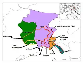 Friuli-Venezia Giulia wine (or Friuli wine) is wine made in the northeastern Italian region of Friuli-Venezia Giulia. Once part of the Venetian Republic and with sections under the influence of the Austro-Hungarian Empire for some time, the wines of the region have noticeable Slavic and Germanic influences. There are 11 Denominazione di origine controllata (DOC) and 3 Denominazione di Origine Controllata e Garantita (DOCG) in the Friuli-Venezia Giulia area. The region has 3 Indicazione Geografica Tipica (IGT) designations Alto Livenza, delle Venezie and Venezia Giulia. Nearly 62% of the wine produced in the region falls under a DOC designation. The area is known predominantly for its white wines which are considered some of the best examples of Italian wine in that style.[1] Along with the Veneto and Trentino-Alto Adige/Südtirol, the Friuli-Venezia Giulia forms the Tre Venezie wine region which ranks with Tuscany and Piedmont as Italy's world class wine regions.[2]