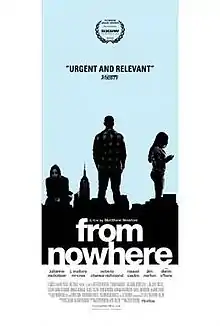 From Nowhere is a 2016 American drama film directed by Matthew Newton and written by Matthew Newton and Kate Ballen. The film stars Julianne Nicholson, Denis O'Hare, J. Mallory McCree, Octavia Chavez-Richmond, Chinasa Ogbuagu, Raquel Castro and Tashiana Washington. The film was released on February 17, 2017, by FilmRise. Three undocumented teenagers -- a Dominican girl, an African boy and a Peruvian girl -- are about to graduate high school in the Bronx, while working with a teacher and a lawyer to try to get proper documents to stay in the U.S. Forced to grow up quickly and navigate problems most adults don't even have to face, the students are really just American teenagers who want to be with their friends, fall in love, and push back against authority.