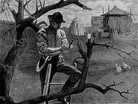 Many species of fruit, e.g., fig, olive, and pomegranate, are commonly grown on their own roots, as there may be no great advantages to using a special rootstock, or suitable rootstocks may not be readily available. However, even for fruit trees that usually are grown grafted on a rootstock, there can be advantages in growing them on their own roots instead, particularly in the traditional coppicing systems advocated in both sustainable agriculture and permaculture. Disadvantages of using own-root trees can include excessive size and excessive production of wood (thus very long times until the start of fruit production), although training branches horizontally and limiting pruning to summer only may help encourage fruit production at an earlier age.[17][18][19] There is a lack of research on the use of the own root method in large-scale systems. British horticulturalist Hugh Ermen was a prominent advocate of own root fruit trees, particularly apple trees, following his work at the Brogdale research centre in Kent.[20] The research undertaken at Brogdale did not continue but there has been renewed academic interest in own root fruit trees since the turn of the century.[21]
