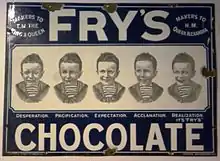 Fry's Chocolate Cream is a chocolate bar developed by J. S. Fry & Sons and currently manufactured by Cadbury. Launched in 1866, Fry's Chocolate Cream is the first mass-produced chocolate bar and is the world's oldest chocolate bar brand.[1][2][3] The original chocolate bar consists of a plain fondant centre enrobed in plain chocolate. Variants include Peppermint Cream, Orange Cream, Raspberry Cream and Strawberry Cream.