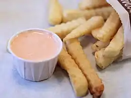 Several fast food chains have individually branded variants of fry sauce using a mayonnaise and ketchup base, including Zaxby's,[10] Raising Cane's,[11][12] and Freddy's.[13]