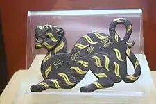 Two-piece tiger tallies (hu-fu, 虎符 in Chinese) were used to verify troop deployment orders from the central government. Left pieces were issued to local commanders, and right pieces were retained by the central government. Government orders were deemed to be authentic if they were accompanied by the right piece matching the recipient's left piece.[4] The word hu-fu first appears in the biography of Hsin-ling in the Records of the Grand Historian, where a stolen tiger tally is used to relieve the state of Zhao.[5] During the Warring States period, this type of fu was made from bronze.[5]