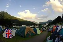 Alternatively, there is a campsite on a golf course next to the festival site which costs ¥3,000 (2011) (equivalent to ¥3,162.49 or US$29.01 in 2019)[1] for the weekend (2011), complete with toilets, showers and food stalls. About 17,000 festival goers choose to spend their nights here every year. The campsite is hilly in many places and flat spots are taken quickly, however, the manicured putting greens, which are the flattest areas are generally out of bounds to campers.