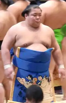 He sat out the March 2014 tournament, recuperating after a detached retina operation. This led to his demotion back to jūryō for the following May 2014 tournament where he only managed a 7–8 record. He won the jūryō division championship in March 2015 and was promoted back to makuuchi, but his return to the top division lasted only one tournament as he could only score 3–12. This has been his last makuuchi appearance to date. He was demoted to the makushita division after the September 2016 tournament, but promoted back to jūryō for March 2017 after a 5–2 score at makushita 3 in January. His stay in jūryō lasted only one tournament and he was back in the makushita division in May 2017. He reached the top rank of the makushita division, #1 East, in May 2019 but just failed to get the majority of wins that would have returned him to jūryō, scoring 3–4. However, he remained near the top of the makushita division and he returned to jūryō after 18 tournaments away for the July 2020 tournament (originally scheduled for May). He maintained his position in jūryō for the September 2020 tournament, but was prevented from entering it due to a COVID-19 outbreak at his stable.[1] Fujiazuma was one of the 19 wrestlers who tested positive.[2] He and the other members of the stable were allowed to keep their ranks for the following tournament in November. In this tournament Fujiazuma lost every one of his fifteen matches, the second straight jūryō wrestler to suffer this fate after Oki in the previous tournament.[3]