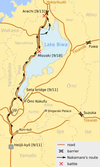 In order to restore authority and prestige, Nakamaro planned a coup d'état.[28] As head of the Middle Guards he seized control of the military in the capital and neighboring provinces, placing his sons in key position at the Palace Guards and as governors of Echizen and Mino Provinces, which were strategic for access to Eastern Honshu.[29] Two other sons (Kuzumaro and Asakari) he named to the Council of State.[28] In return Kōken appointed Fujiwara no Masaki (a critic of Nakamaro) to "Middle Counselor" and had 69-year-old Kibi no Makibi brought back from exile.[28] The latter had played a major role during the Hirotsugu Rebellion and was an expert in Chinese strategy. He was put in charge with the preparation of forces and the reinforcement of defensive works at the Seta River, which would turn out to cut off Nakamaro from the Eastern Provinces.[32] On the 2nd day of the 9th month (October 1) of 764, Nakamaro asked Kōken to name him "Supervisor of Military Messengers from the Four Provinces of the Kinai, the Three Provinces of the Passes (Echizen, Mino, Ise) and Ōmi, Tanba, and Harima".[18]