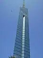 Fukuoka Tower has a triangular cross-section which is covered with 8000 half-mirrors, giving it the appearance of a skyscraper.[2] Because of this, it has been given the nickname "Mirror Sail". The half-mirrors reflect the sky when viewed from outside the structure but allow visitors to see outside while riding elevators to the top. The space between the base and the observation decks is hollow and thus unoccupied. There are three observation decks: one at 116 metres, a café/lounge deck at 120 metres, and the highest at 123 metres above the ground. Above this level rises a 111-metre television mast.