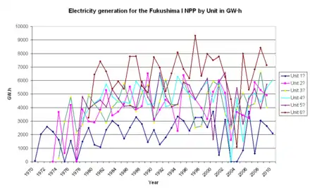 Unit 1 is a 460 MW boiling water reactor (BWR-3) constructed in July 1967. It commenced commercial electrical production on March 26, 1971, and was initially scheduled for shutdown in early 2011.[17] In February 2011, Japanese regulators granted an extension of ten years for the continued operation of the reactor.[18] It was damaged during the 2011 Tōhoku earthquake and tsunami.[19]