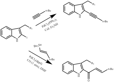 The Fukuyama Indole synthesis can generate a range of different substituents at the 2,3 position that were previously unattainable without a protecting group on the nitrogen in the ring. One such example is the 2-iodoindole derivative, which can then lead to a variety of N-unprotected 2,3 substituted indoles. Before the discovery of this compound the chemistry involving 2-stannylindoles was not developed as there was no way to practically synthesis these N-unprotected 2,3-stannylindoles. One was limited to the production of N-protected 2-stannylindoles through metalation by a process known as Stille coupling.[6] The N-unprotected 2-stannylindoles generated from the Fukuyama Synthesis can be readily oxidized with iodine opening up an area of chemistry that allows for the synthesis of a variety compounds utilizing the 2-iodoindoles as a starting reagent. This iodine substituted derivative can lead to aryl halides, vinyl iodides, vinyl triflates, benzyl bromides.
