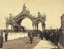 When the tomb was completed in 1874, Lincoln's coffin was placed in a white marble sarcophagus in a burial room behind a steel gate locked with a padlock. In November 1876, Chicago counterfeiter James "Big Jim" Kennally planned to steal Lincoln's body and hold it in exchange for a pardon for his engraver (who was serving a ten-year sentence at Illinois State Penitentiary) and $200,000 (approximately $5,089,000 today).[11][12] The plot failed when two men recruited to assist turned out to be paid government informants,[11][12] and the men sent to get the body did not plan for how to remove the quarter-ton cedar-and-lead coffin from the grounds.[12]